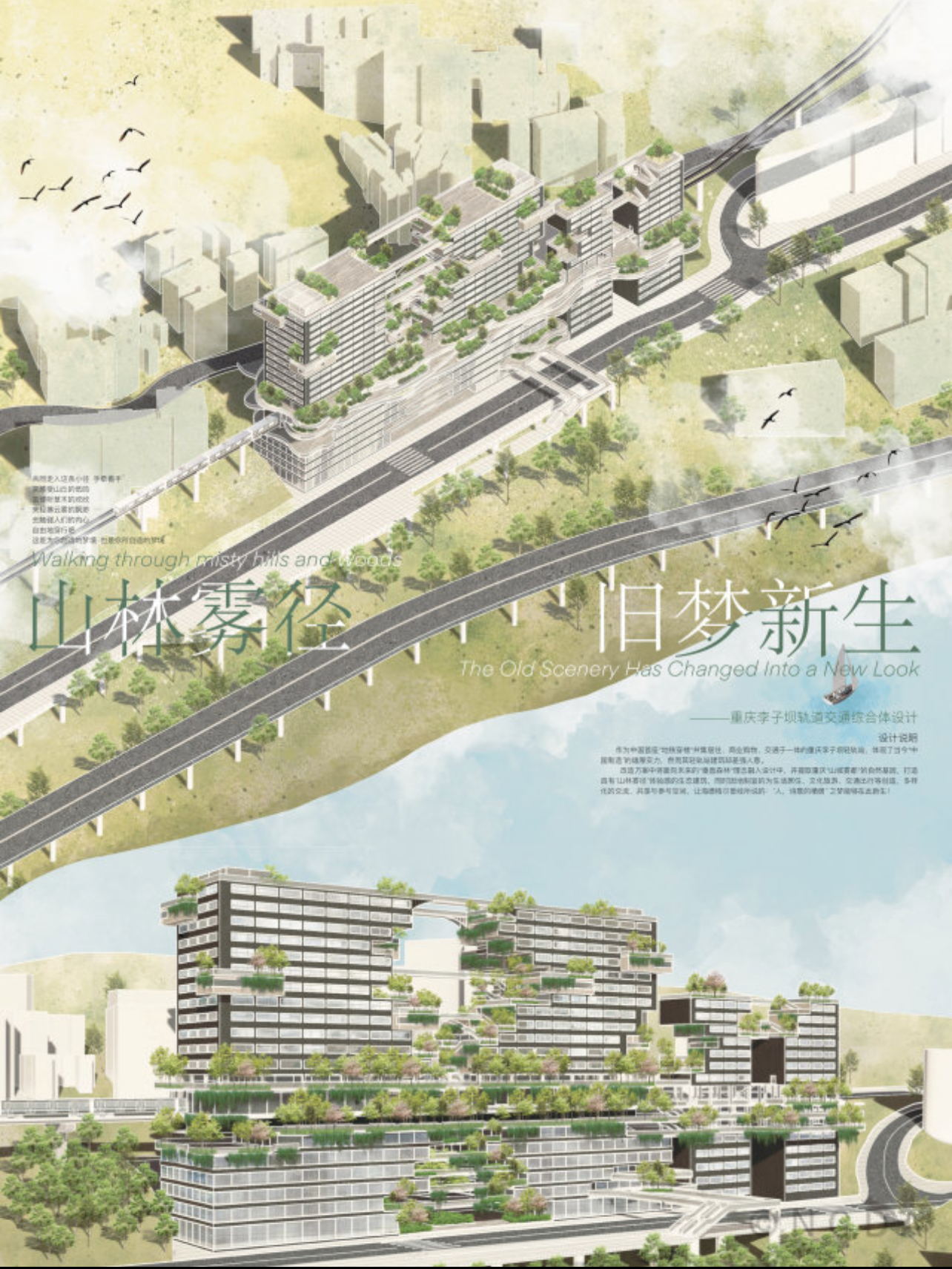 作为中国首座"地铁穿楼"并集居住、商业购物、交通于一体的重庆李子坝轻轨站,体现了当今"中国制造”的雄厚实力,然而其轻轨站建筑却差强人意。 改造方案中将面向未来的"垂直森林"理念融入设计中,并提取重庆"山城雾都"的自然基因,打造具有“山林雾径”体验感的生态建筑,同时因地制宜的为生活居住、文化旅游、交通出行等创造出多样化的交流、共享与参与空间,让海德格尔曾经所说的:“人,诗意的栖居”之梦能够在此新生。