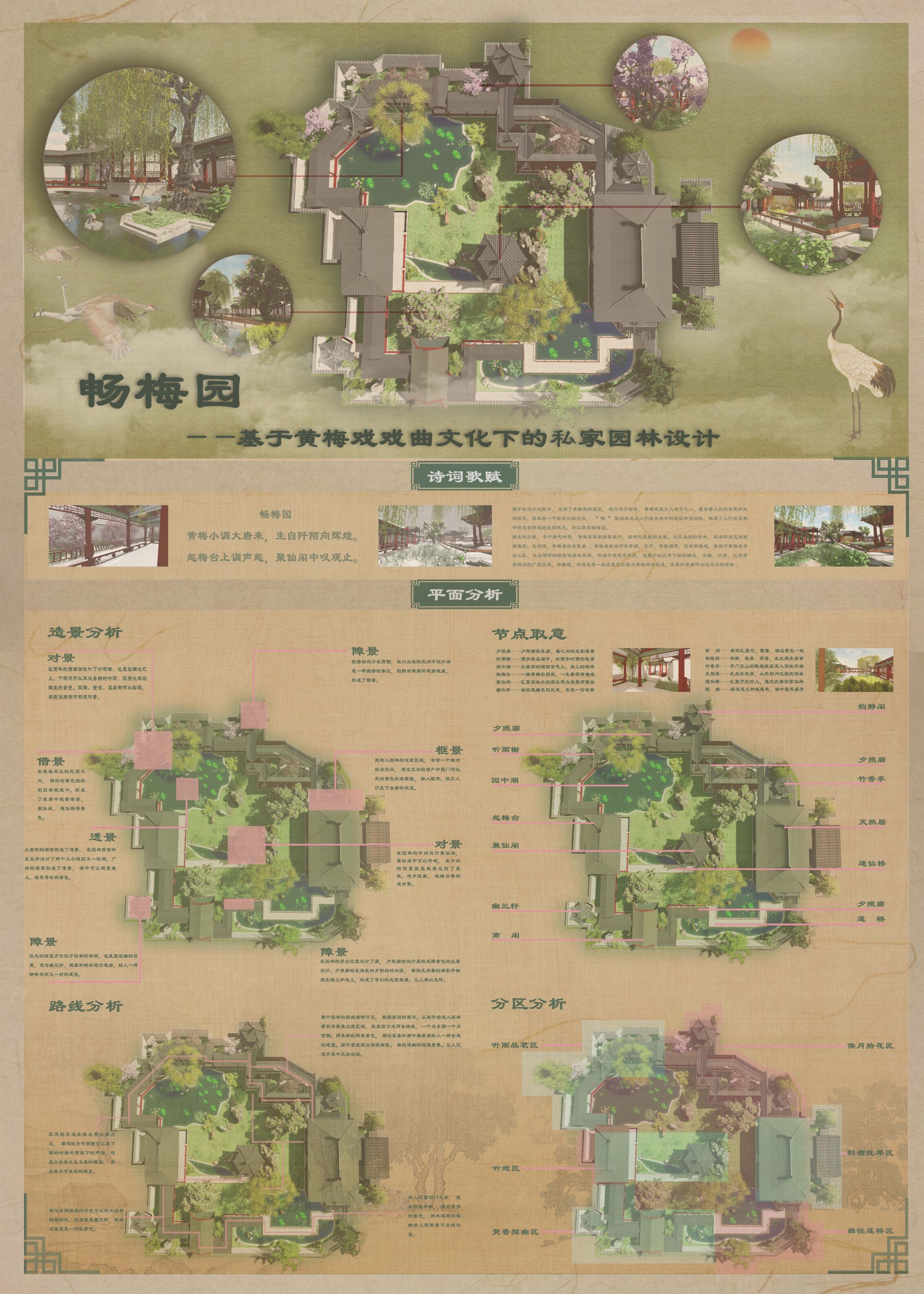 园林是一个自然化的空间。在设计构思中,将我国传统五大戏曲之一的黄梅戏中的相关元素融入其中。 “畅” 能够表达出人们在自然中的游玩和灵动性,“梅”能体现出审美。表达出人们在园林中的自在舒适的生活状态。