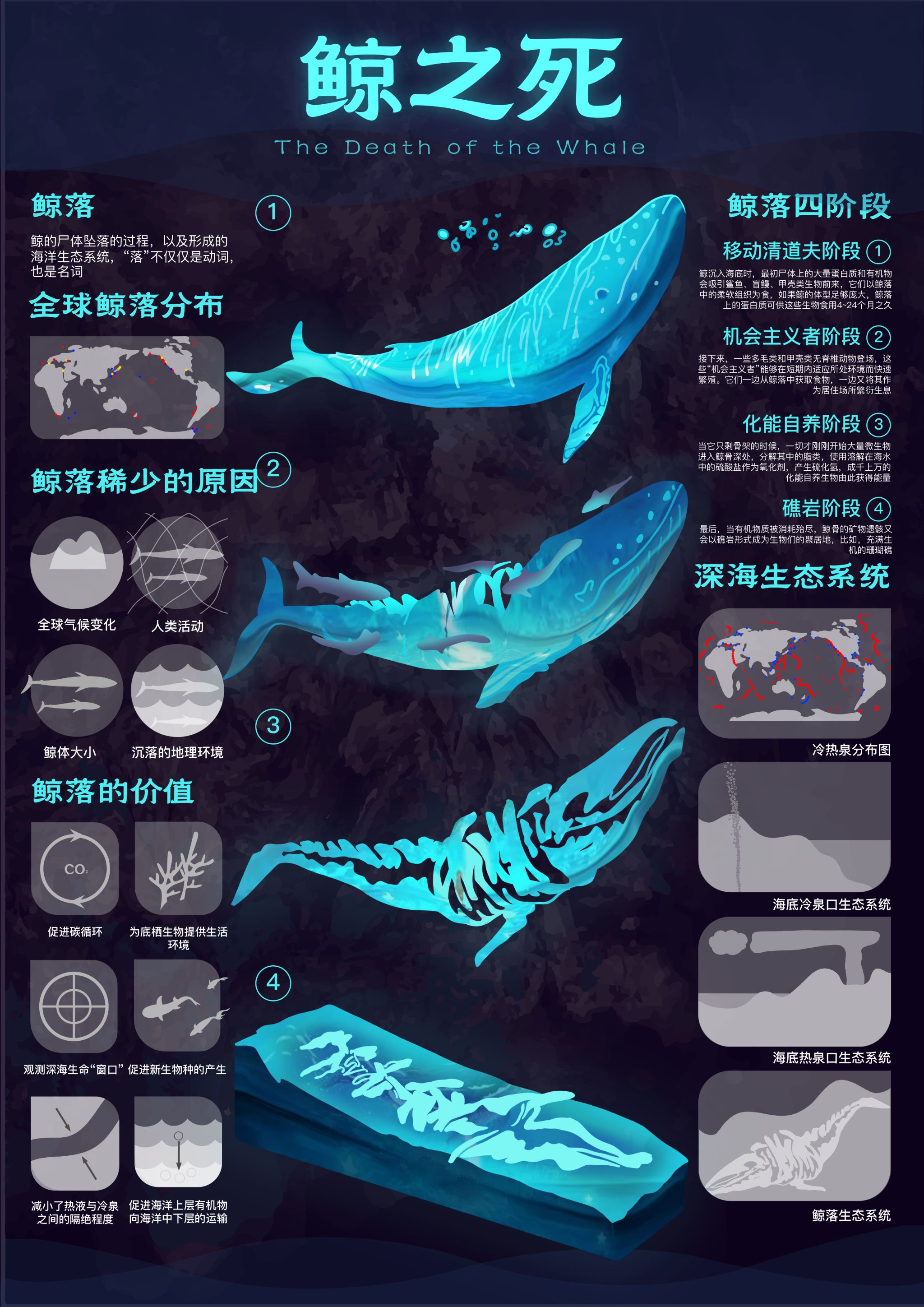 鲸落是当一只鲸鱼死去,它的尸体会沉入海底,然后在这里点亮一个新的生态系统。“一鲸落而万物生”的浪漫由此而来。本信息可视化设计,从“鲸之生”和“鲸之死”两个板块入手,剖析“鲸落”现象的生态奥妙。