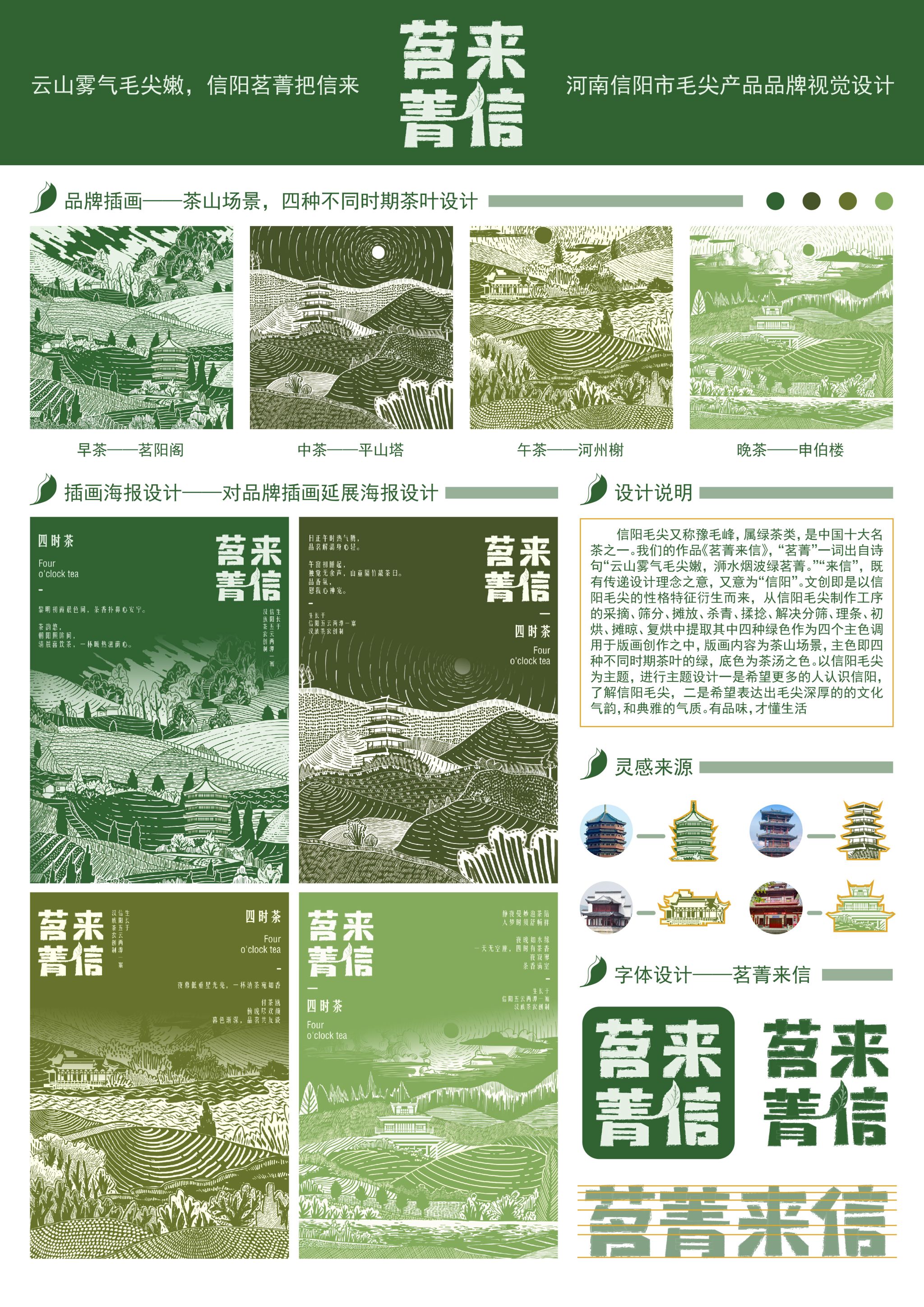 信阳毛尖又称豫毛峰,属绿茶类,是中国十大名茶之一。“茗菁”一词出自诗句“云山雾气毛尖嫩,浉水烟波绿茗菁。”“来信”,既有传递设计理念之意,又意为“信阳”,从信阳毛尖制作工序提取其中四种绿色作为四个主色调用于版画创作之中,与信阳地表性建筑,信阳新八景之四“茗阳阁”“平山塔”“河州榭”“申伯楼”结合,进行版画创作。